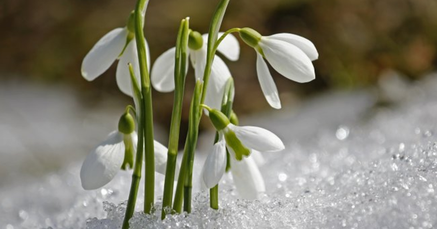 Acum apar primele flori, cele mai curajoase și mai firave în același timp, ghioceii. Cresc în locuri ferite de vânt, cu fața spre soare, pe un sol reavăn, înconjurat de un guler de zăpadă ce se topește încet, în stropi ca de cristal. Iarna, cu toată puterea ei, se pleacă în fața acestei minuni ce îmbină două culori simbolice: albul imaculat al zăpezii cu verdele crud al primăverii.