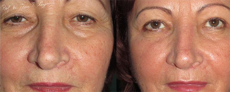 Deplasarea inferioara a complexului sprancenelor este rezultatul actiunii combinate a muschilor procerus, corrugator supercilli si muschii orbicularis oculi, impreuna cu efectele gravitationale.