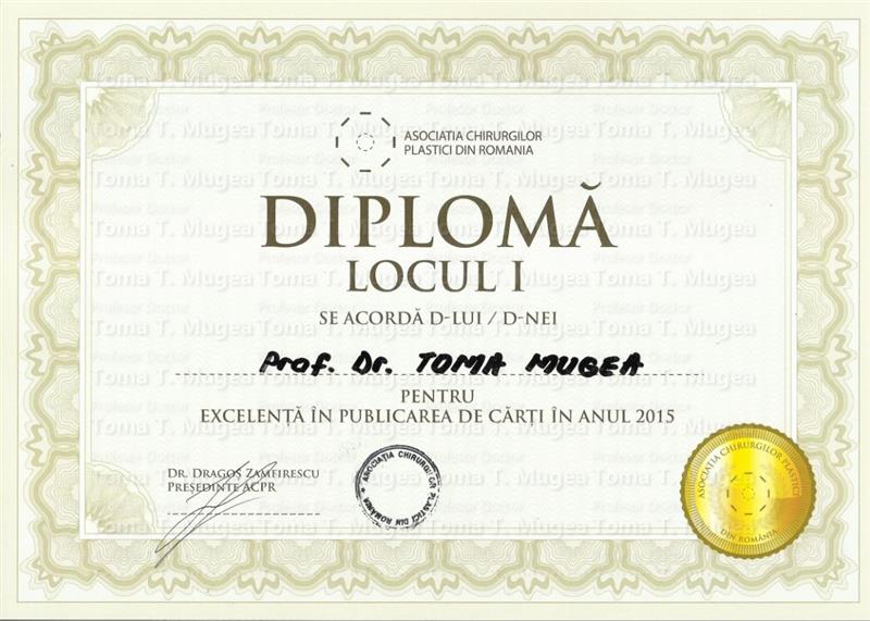Domnul Prof. Dr. Toma T. Mugea a fost felicitat pentru activitatea sa profesionala de catre Asociatia Chirurgilor Plastici din Romania si premiat cu premiul I pentru excelenta in publicarea de carti in anul 2015 si premiul I pentru excelenta in activitatea stiintifica din anul 2015.