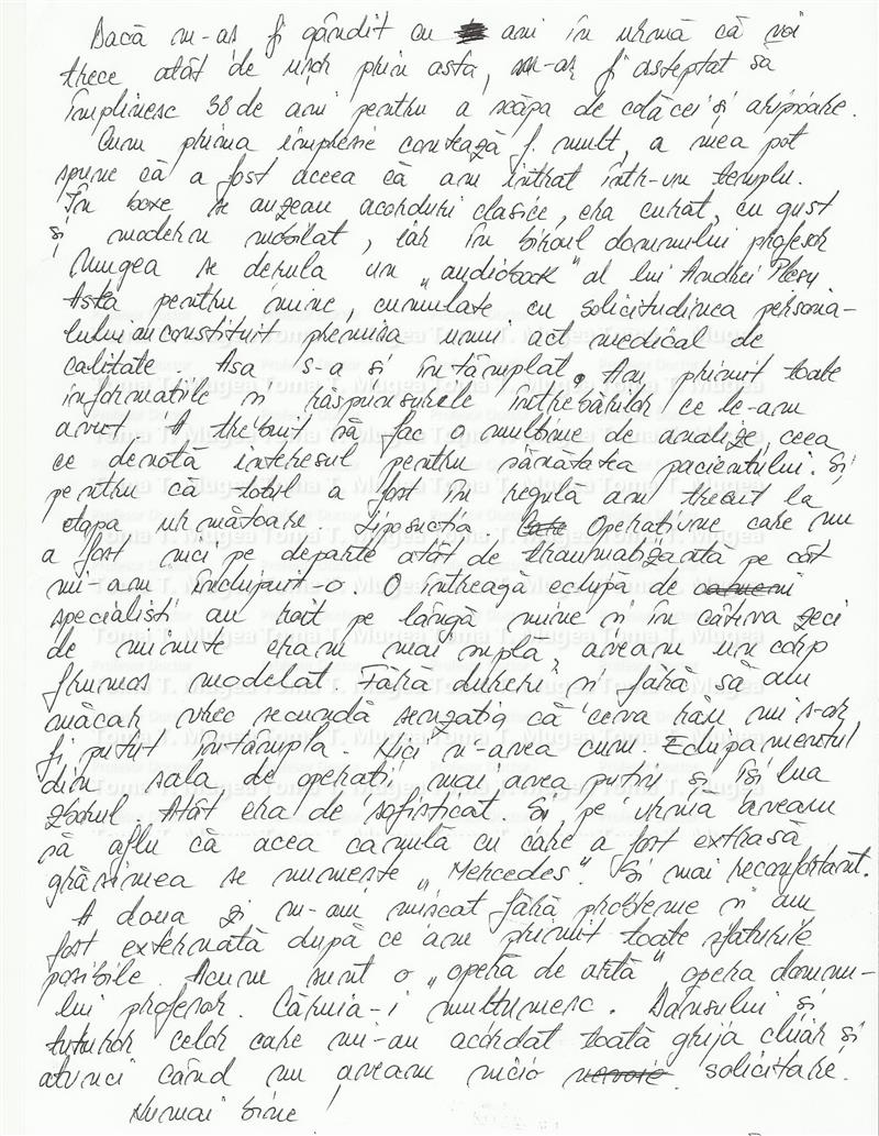 Cum prima impresie conteaza foarte mult, a mea pot spune ca a fost aceea ca am intrat intr-un templu. In boxe se auzeau acorduri clasice, era curat, cu gust si modern mobilat, iar in biroul domnului profesor Mugea se derula un „audiobook” al lui Andrei Plesu. Astea pentru mine, cumulate cu solicitudinea personalului au constituit premisa unui act medical de calitate. Asa s-a si intamplat. Am primit toate informatiile si raspunsurile intrebarilor ce le-am avut. A trebuit sa fac o multime de analize, ceea ce denota interesul pentru sanatatea pacientului. Si pentru ca totul a fost in regula am trecut la etapa urmatoare. Liposuctia. Operatiune care nu a fost nici pe departe atat de traumatizanta pe cat mi-am inchipuit-o. O intreaga echipa de specialisti au roit pe langa mine si in cateva zeci de minute eram mai supla, aveam un corp frumos modelat. Fara dureri si fara sa am macar vreo secunda senzatia ca ceva rau mi s-ar fi putut intampla. Nici n-aveam cum. Echipamentul din sala de operatii mai avea putin si isi lua zborul. Atat era de sofisticat. Si pe urma aveam sa aflu ca acea canula cu care a fost extrasa grasimea se numeste „Mercedes”. Si mai reconfortant.