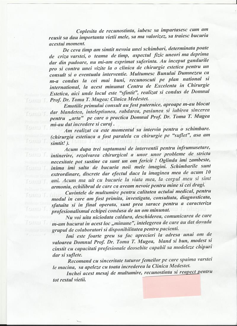 De ceva timp am simtit nevoia unei schimbari, determinata poate de criza varstei, o teama de timp, aspectul fizic uneori ma deprima dar din pudoare, nu mi-am exprimat suferinta. Au inceput gandurile pro si contra unei vizite la o clinica de chirurgie estetica pentru un consult si o eventuala interventie. Multumesc Bunului Dumnezeu ca m-a condus la cei mai buni, recunoscuti pe plan national si international, la acest minunat Centru de Excelenta in Chirurgie Estetica, aici unde locul este „sfintit”, realizat si condus de Domnul Prof. Dr. Toma T. Mugea: Clinica Medestet.