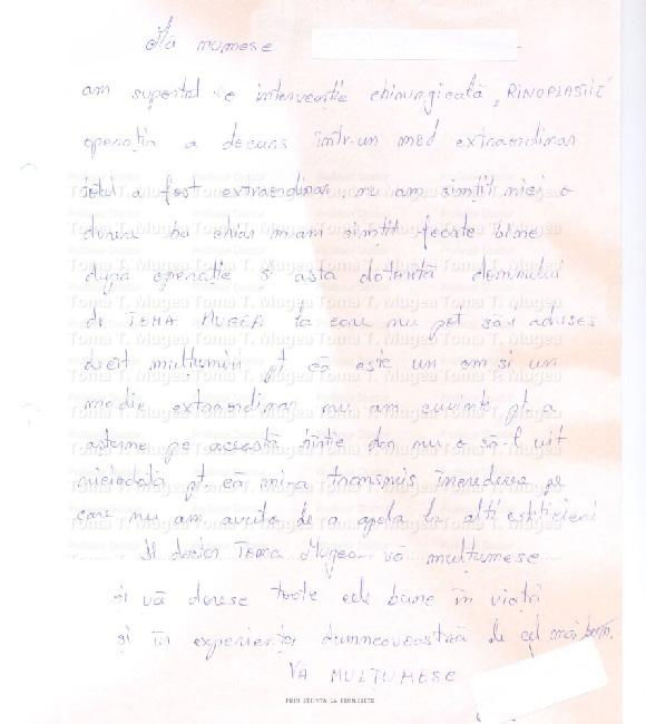 „Am suportat o interventie chirurgicala „RINOPLASTIE”. Operatia a decurs intr-un mod extraordinar, totul a fost extraordinar, nu am simtit nici o durere ba chiar m-am simtit foarte bine dupa operatie si asta datorita domnului Dr. Toma Mugea la care nu pot sa-i adresez decat multumiri pt ca este un om si un medic extraordinar, nu am cuvinte pt a asterne pe aceasta hartie dar nu o sa-l uit niciodata pt ca mi-a transmins increderea pe care nu am avut-o de a apela la alti esteticieni”
