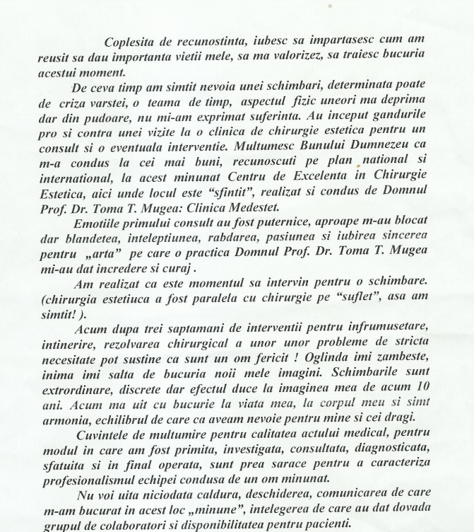 De ceva timp am simtit nevoia unei schimbari, determinata poate de criza varstei, o teama de timp, aspectul fizic uneori ma deprima dar din pudoare, nu mi-am exprimat suferinta. Au inceput gandurile pro si contra unei vizite la o clinica de chirurgie estetitca pentru un consult si o eventuala interventie. Multumesc Bunului Dumnezeu ca m-a condus la cei mai buni, recunoscuti pe plan national si international, la acest minunat Centru de Excelenta in Chirurgie Estetica, aici unde locul este „sfintit”, realizat si condus de Domnul Prof. Dr. Toma T. Mugea: Clinica Medestet.