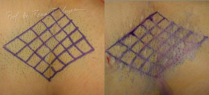 Sunt persoane cu o toleranta buna la durere la care injectrea se poate faca doar cu o sedare usoara, dar uneori pacientul are nevoie de o anestezie generala de scurta durata, deoarece injectarea intradermica in zona axilei, palmelor sau picioarelor este foarte dureroasa. Dupa injectare pe zona tratata se aplica un strat de comprese raci cu gheata, pentru a induce o vasocostrictie locala ce impiedica difuziunea substantei pe o suprafata cu diametrul mai mare de 1 cm si asigura obtinerea unor efecte previzibile.