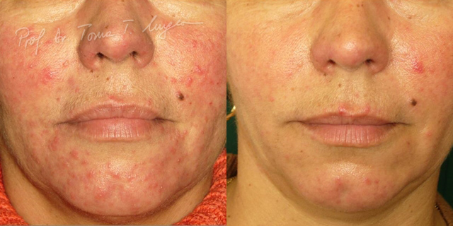 In cazurile severe, vindecarea spontana se face prin cicatrici dizgratioase, marturii ale leziunilor si traumatismelor la care a fost supusa pielea de catre degetele pacientului sau cosmeticienei.